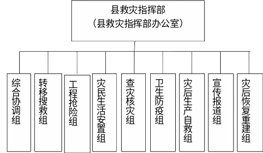 啟動Ⅰ級或Ⅱ級響應(yīng)時,縣救災(zāi)指揮部根據(jù)工作需要可設(shè)立若干個工作組分頭開展工作,各組職責(zé)如下: