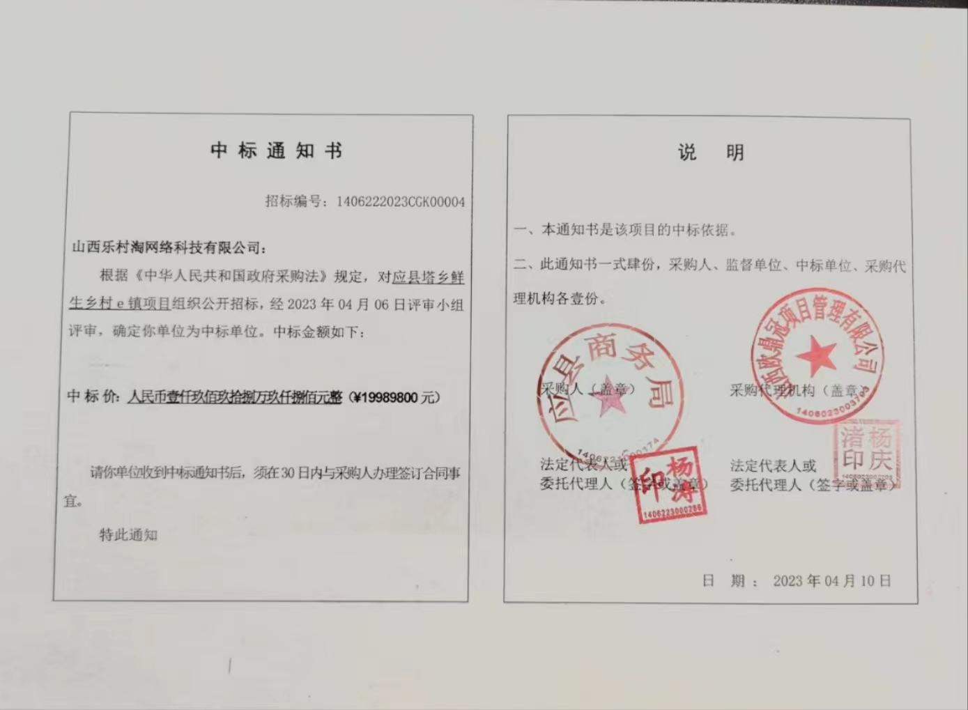 根據(jù)山西省商務(wù)廳、山西省財政廳、山西省鄉(xiāng)村振興局《關(guān)于支持山西省鄉(xiāng)村e鎮(zhèn)培育項目名單的通知》(晉商建〔2022〕176號)精神,應(yīng)縣塔鄉(xiāng)鮮生鄉(xiāng)村e鎮(zhèn)項目列入第二批山西省鄉(xiāng)村e鎮(zhèn)培育項目名單。2023年3月委托第三方公司依法依規(guī)組織項目招標(biāo)采購,2023年4月6日依據(jù)合法合規(guī)流程經(jīng)評審小組評審,確定中標(biāo)單位為山西樂村淘網(wǎng)絡(luò)科技有限公司。